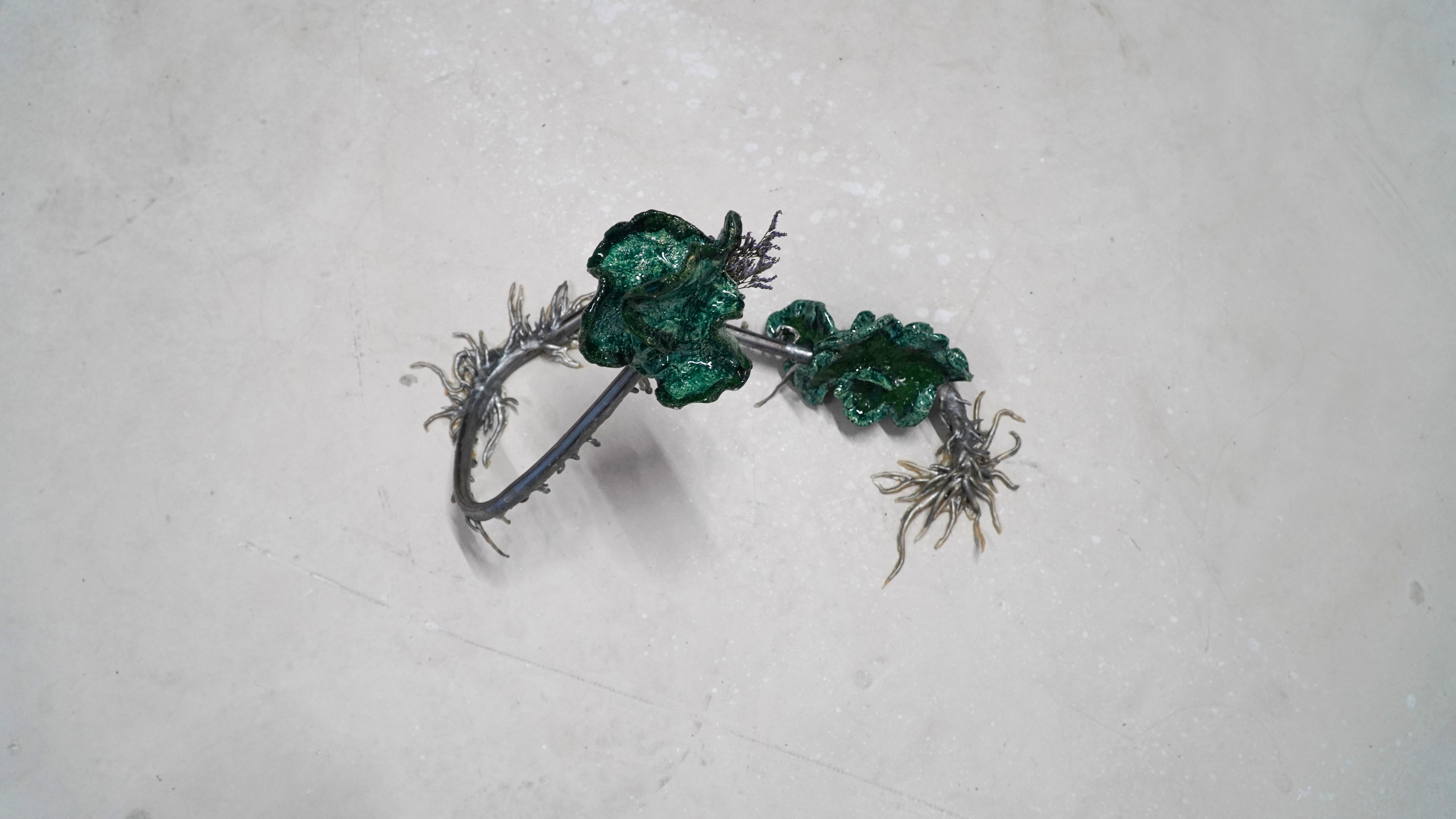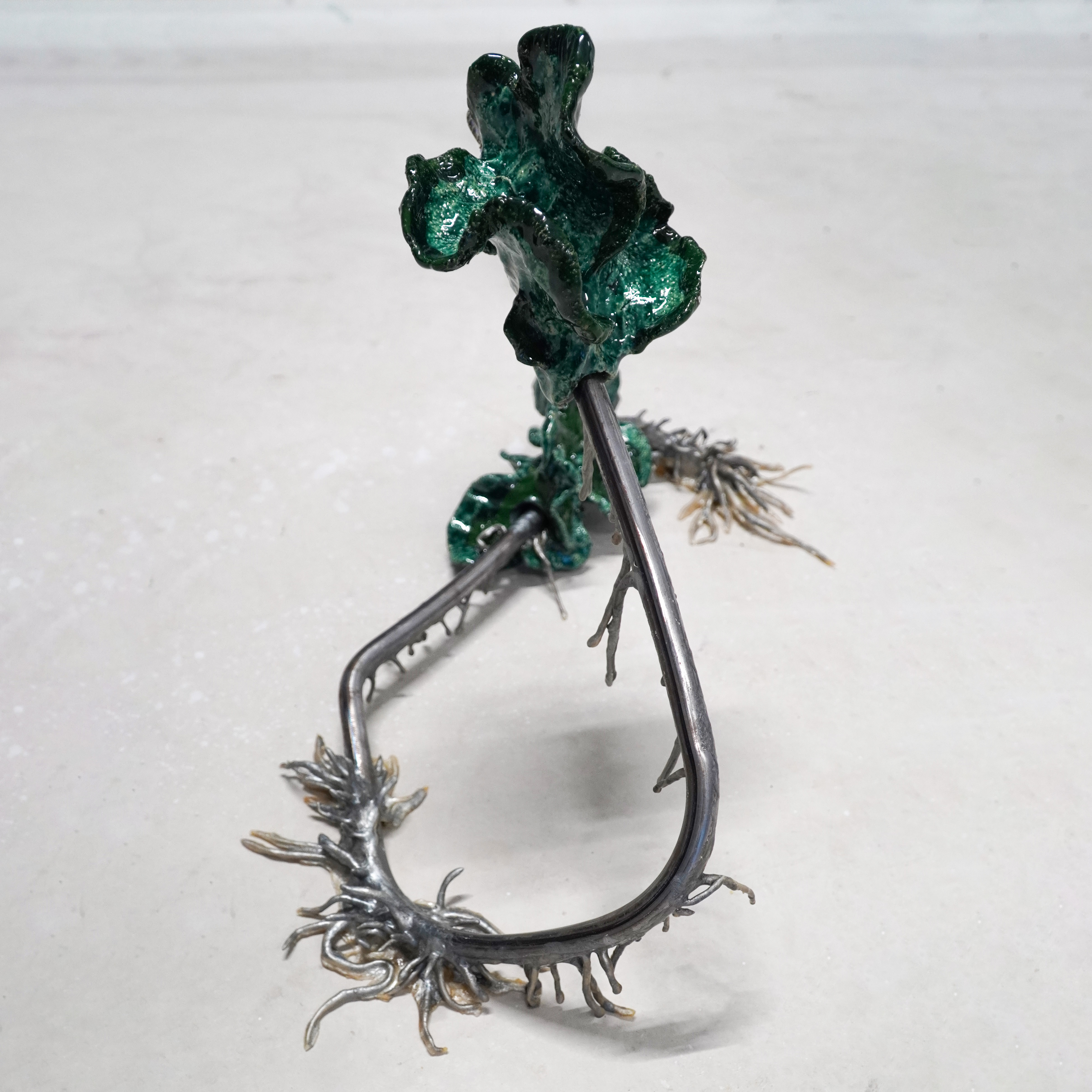 Discarded steel tube, nature latex, clay, metallic pigment, ceramic glaze and dried sea lavender