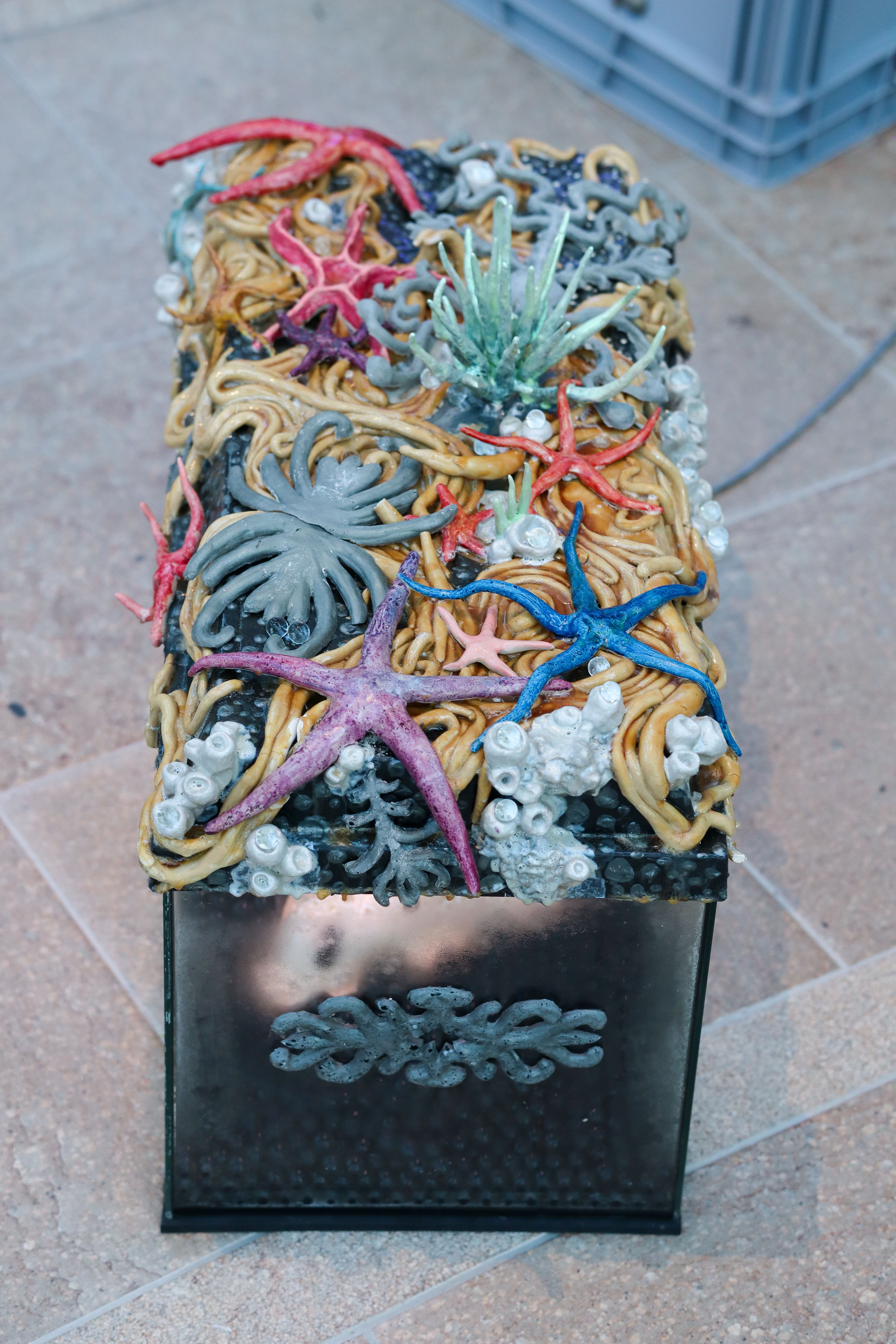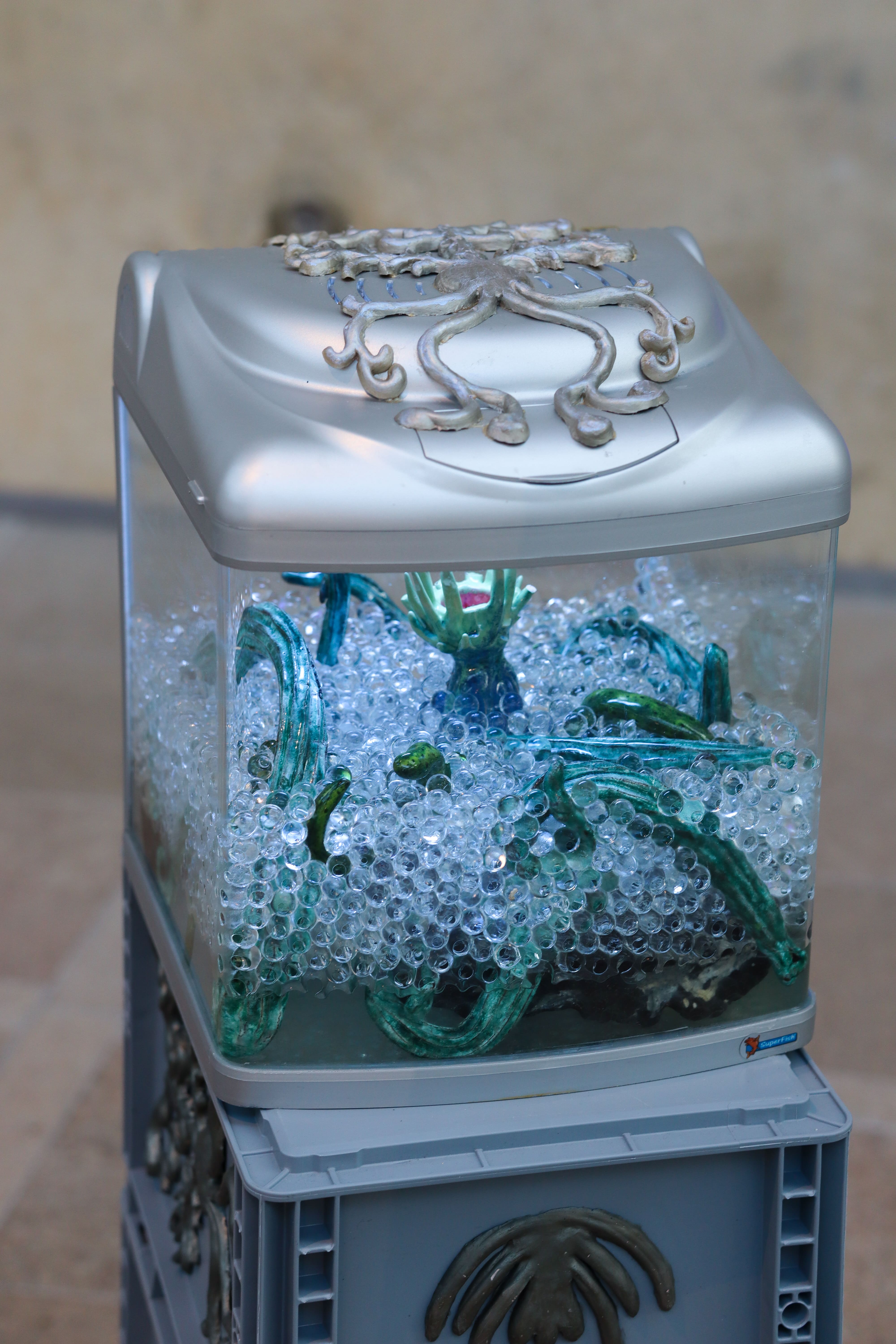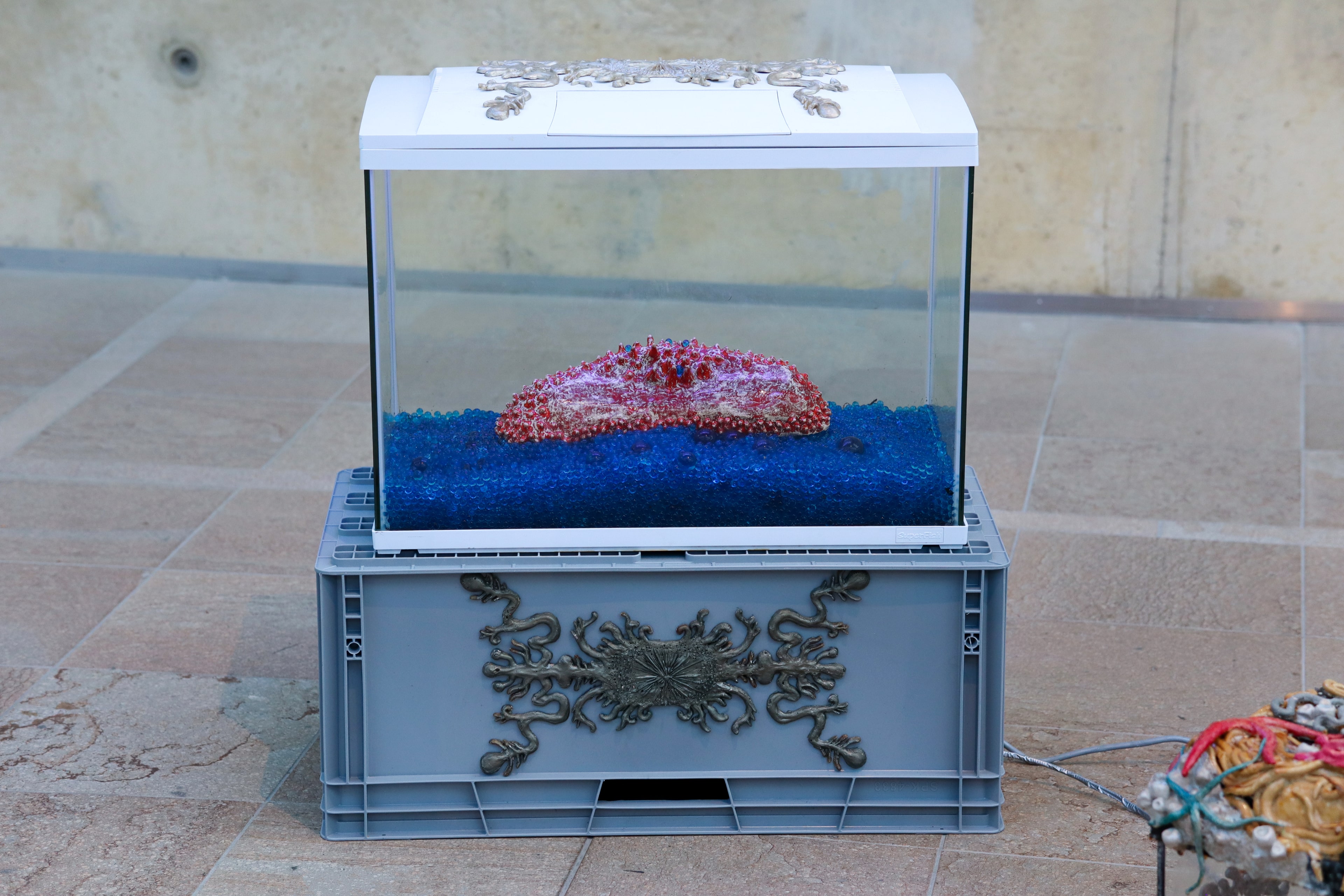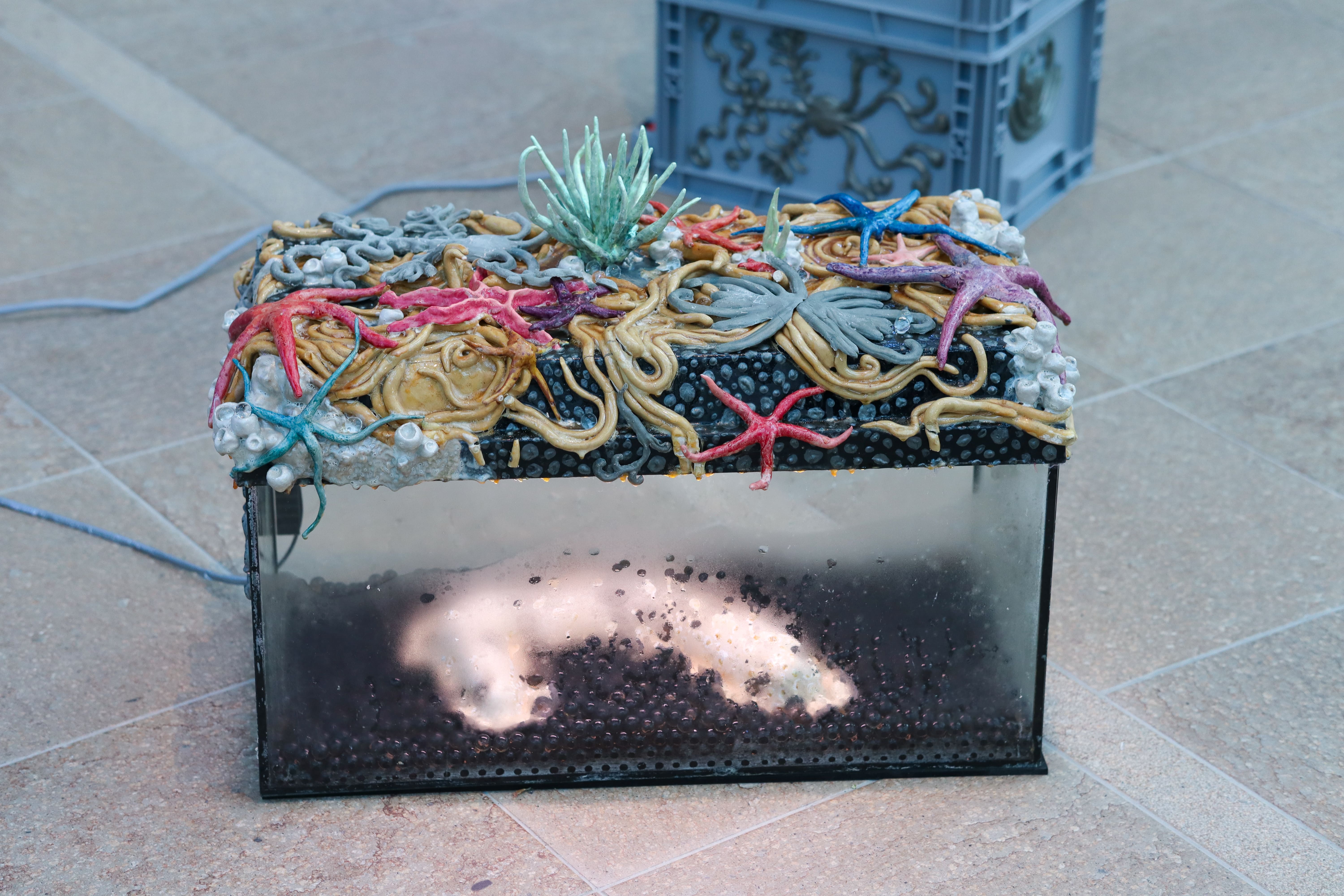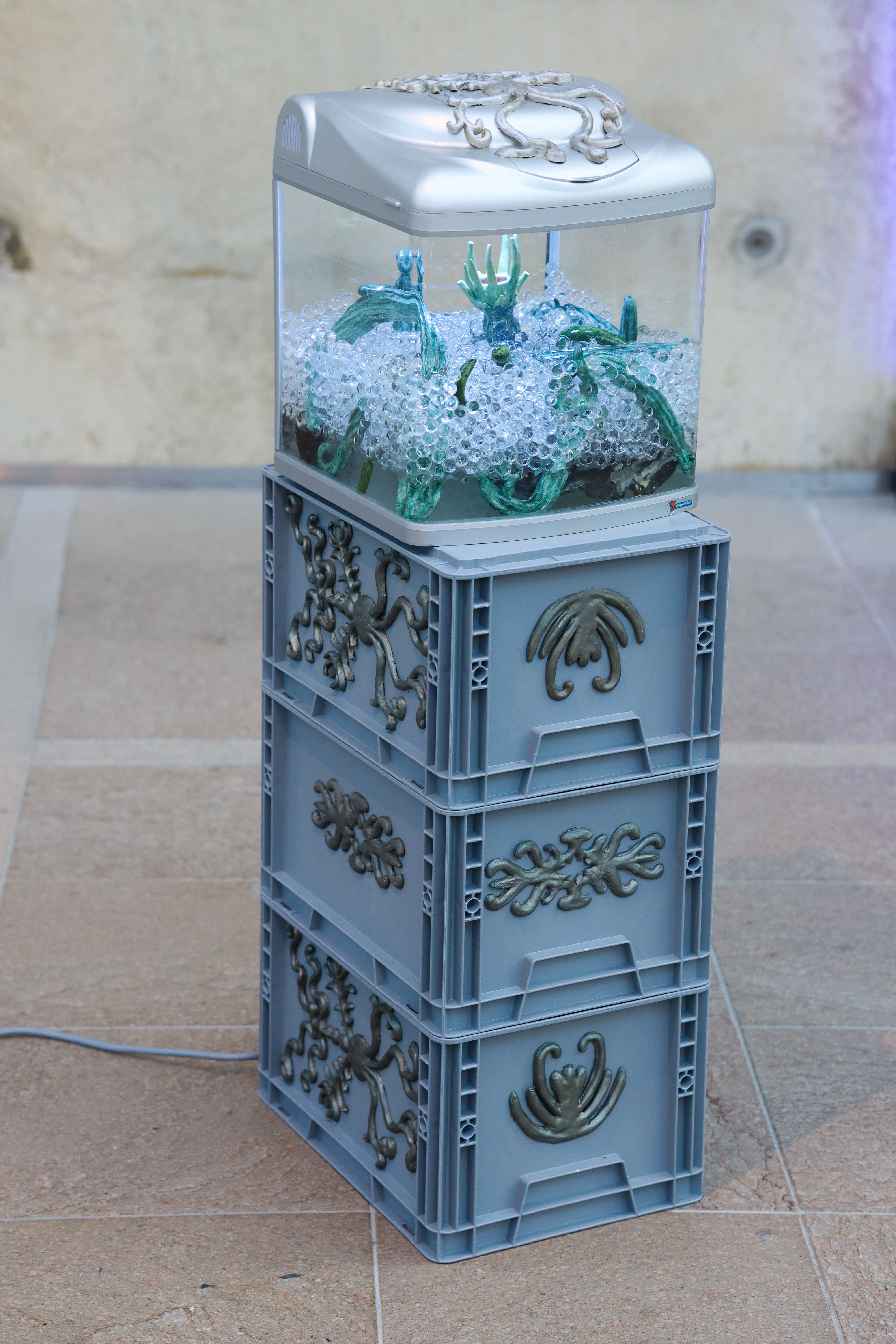 Vivaria 2.0 is an assemblage of ceramics and aquariums, resting on euro-boxes adorned with silver latex ornaments, cast in hand-carved clay-molds.
