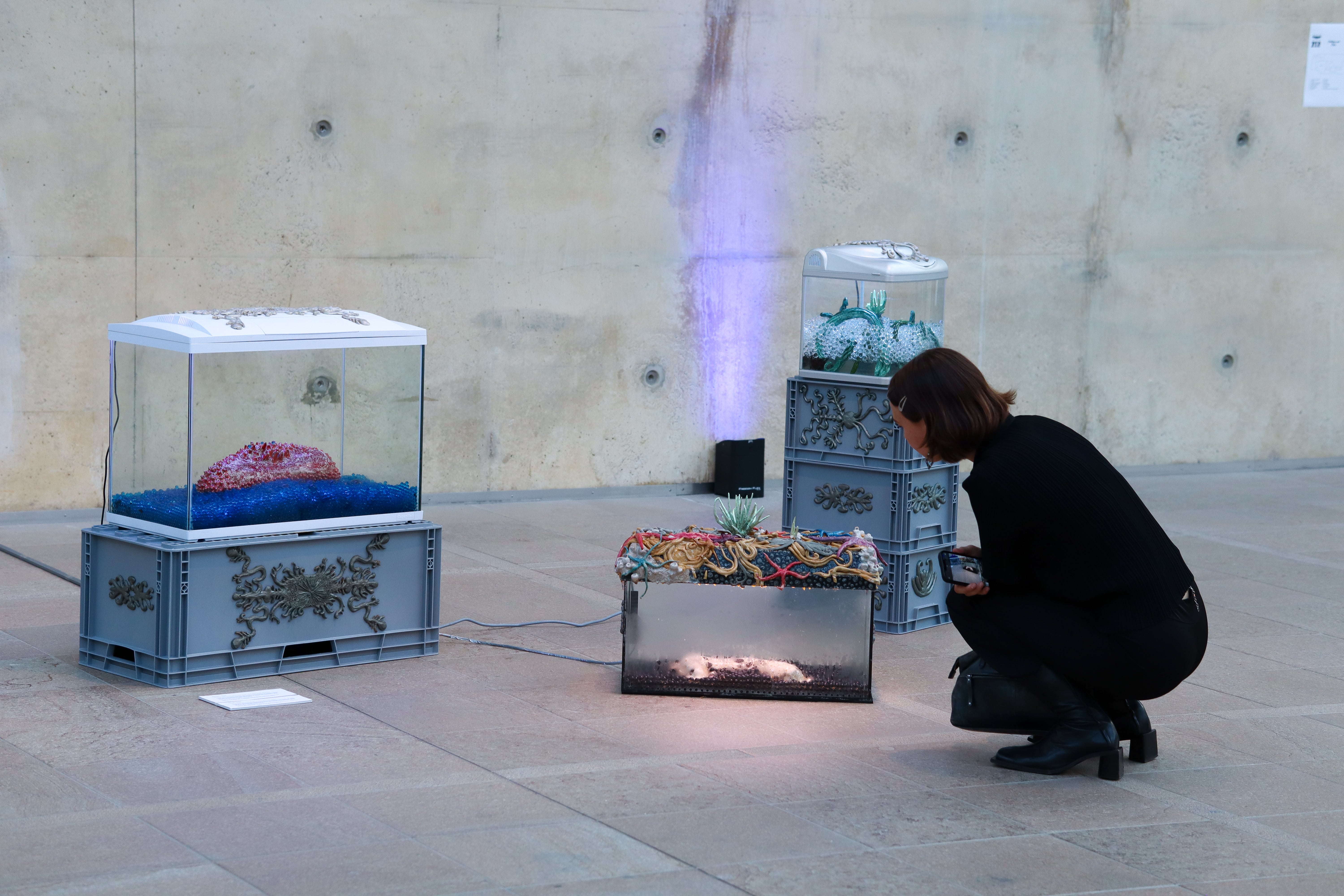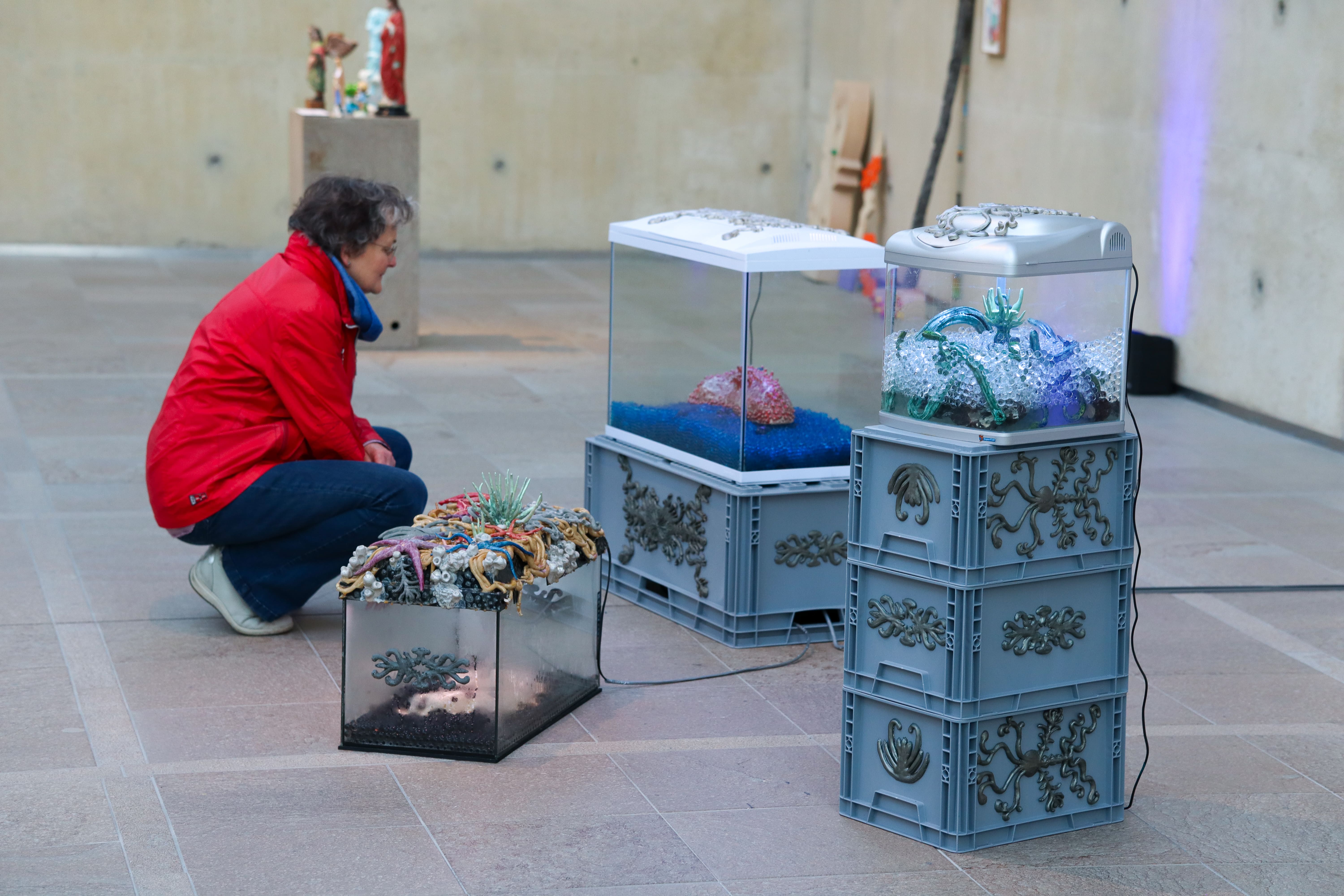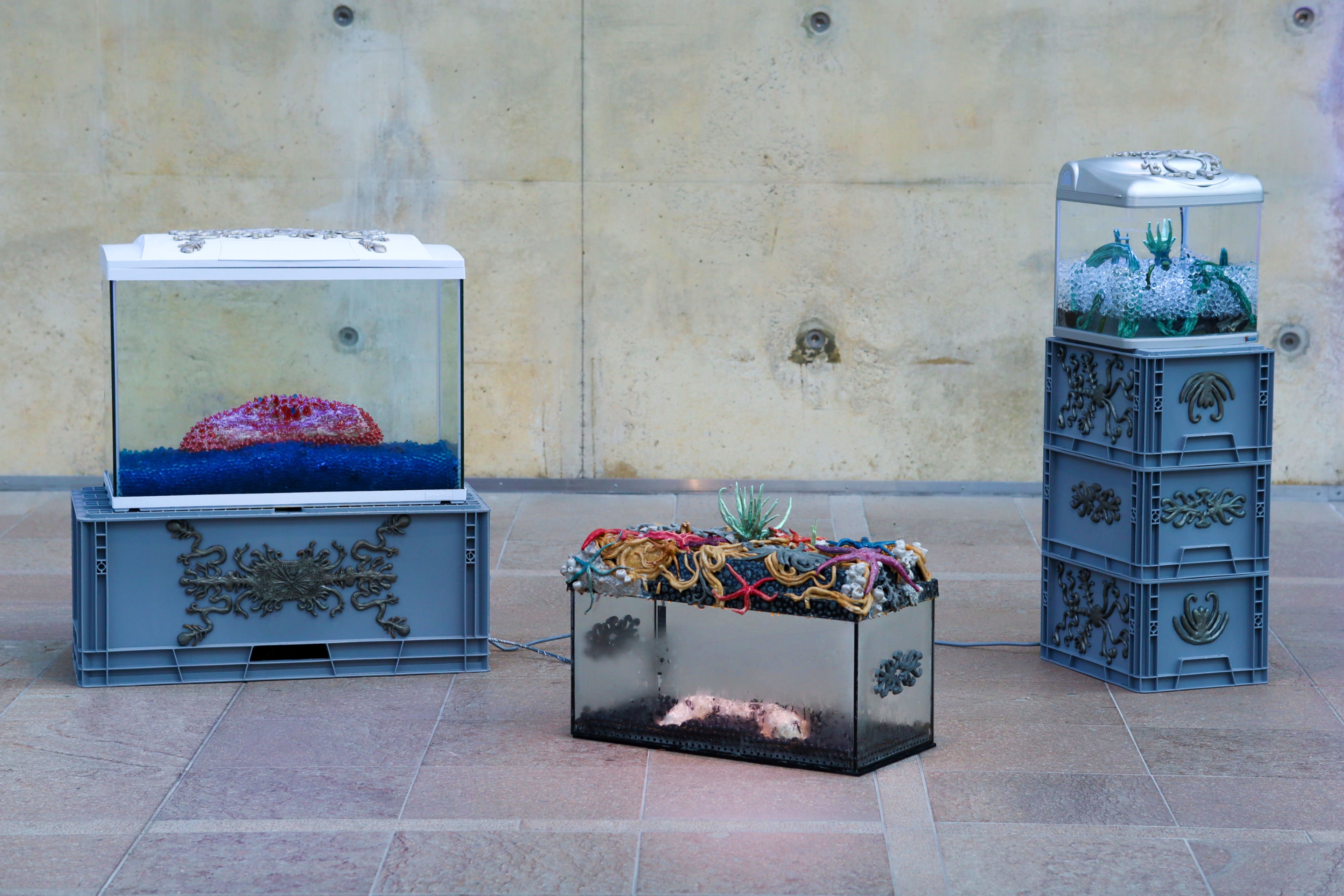 Ceramics, euro-boxes, natural latex, acrylic paint, water pearls, aquariums80 x 40 x 85 cm / 60 x 30 x 47 / 40 x 30 x 100 cm