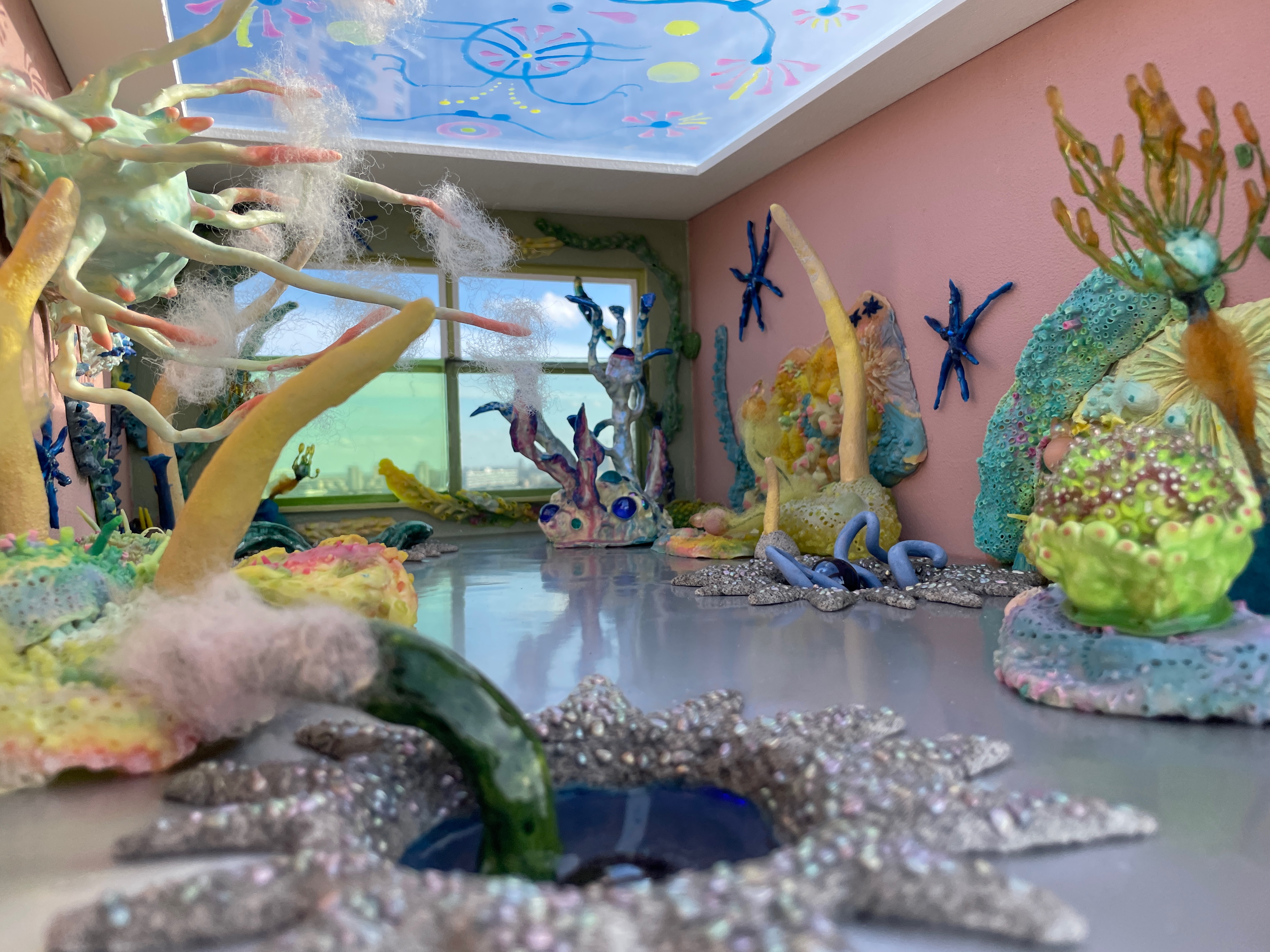 Clay (natural and air-drying), ceramics, styrofoam, natural latex, acrylic paint, ink, glass, wool, gem stones, beads