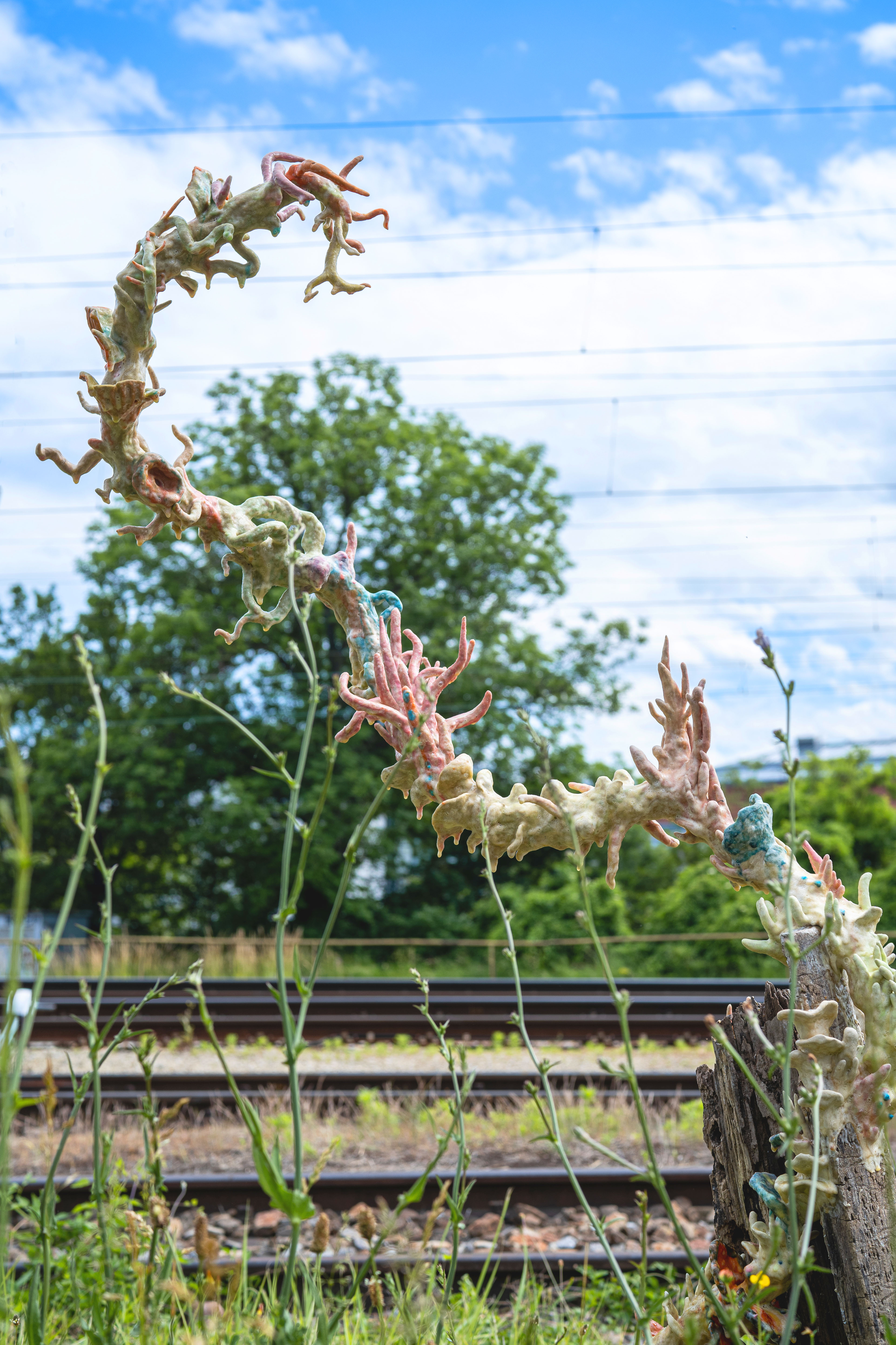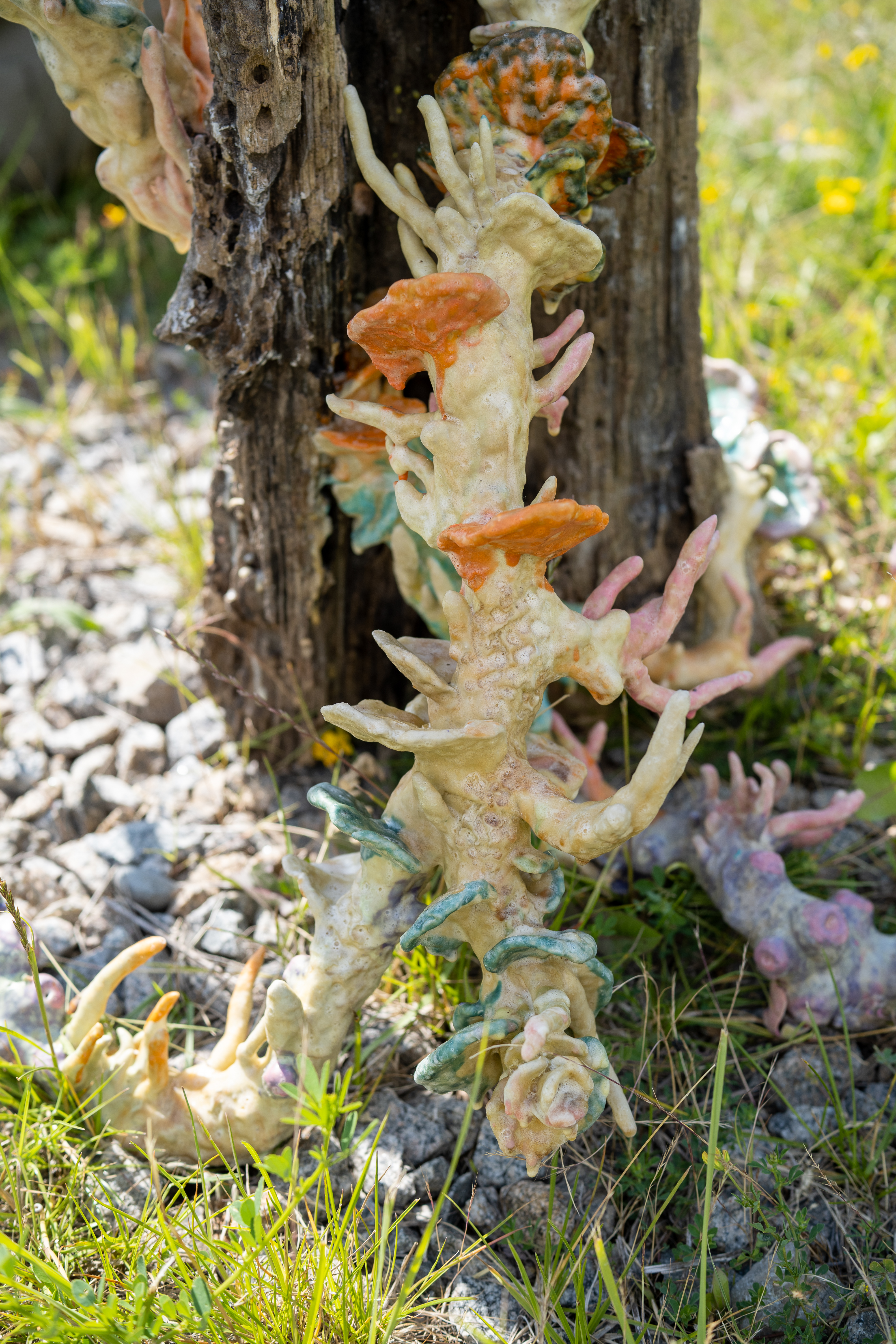 Metal, unfired clay, latex, pigment, found wood
